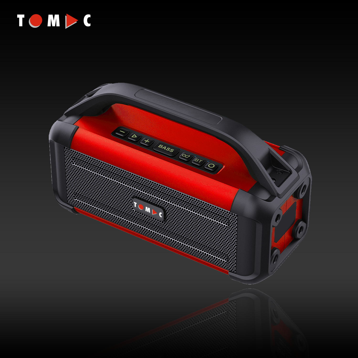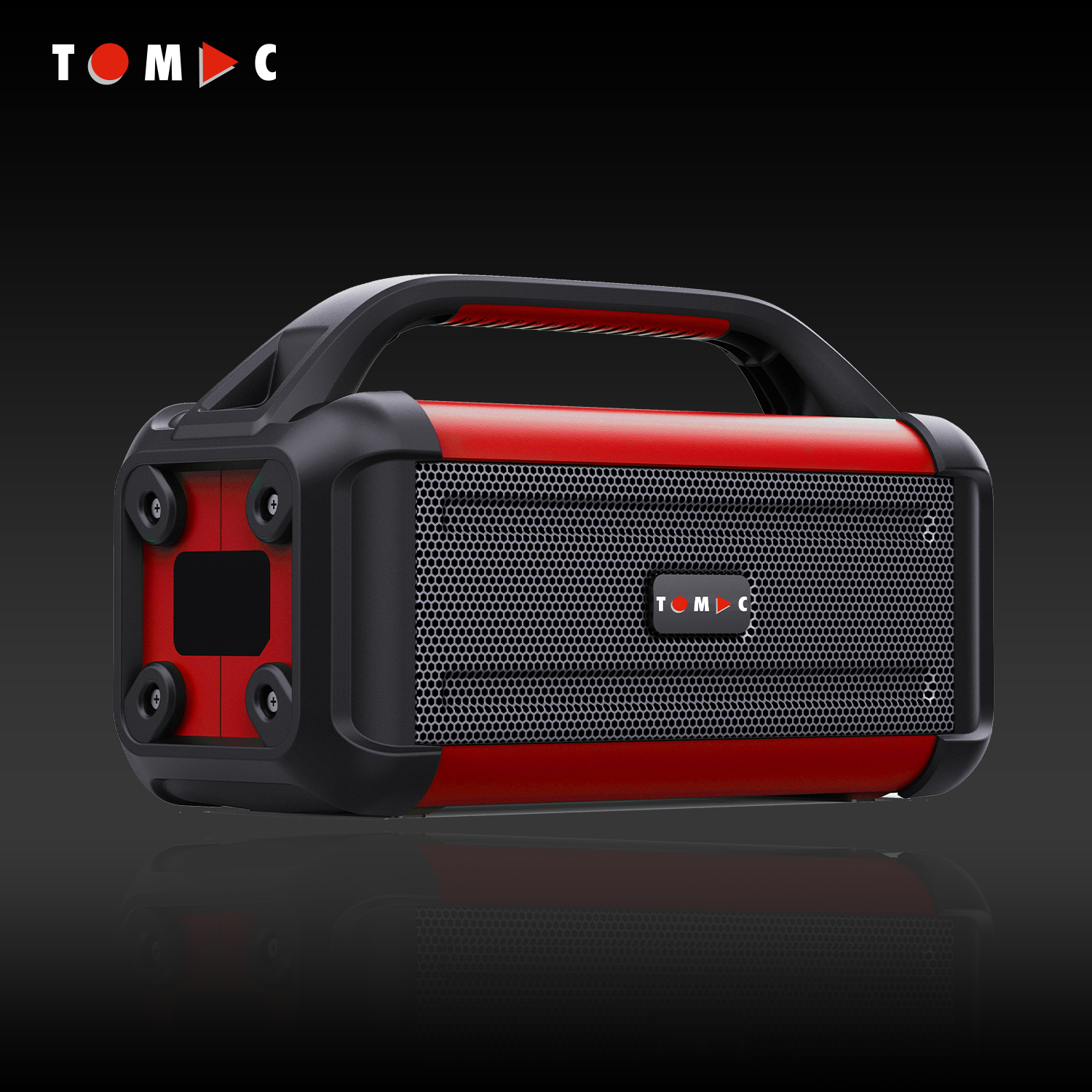 سماعة بلوتوث محمولة من طراز TC40B TOMAC بقوة ٤٠ واط جذرية مُربّعة (RMS)، مع إمكانية الاتصال المزدوج اللاسلكي (TWS) ومدخلات AUX/USB/تيار متردد (AC)، ووظيفة تعزيز الجهير (BASS Boost) مع شهادة المطابقة الأوروبية (CE)