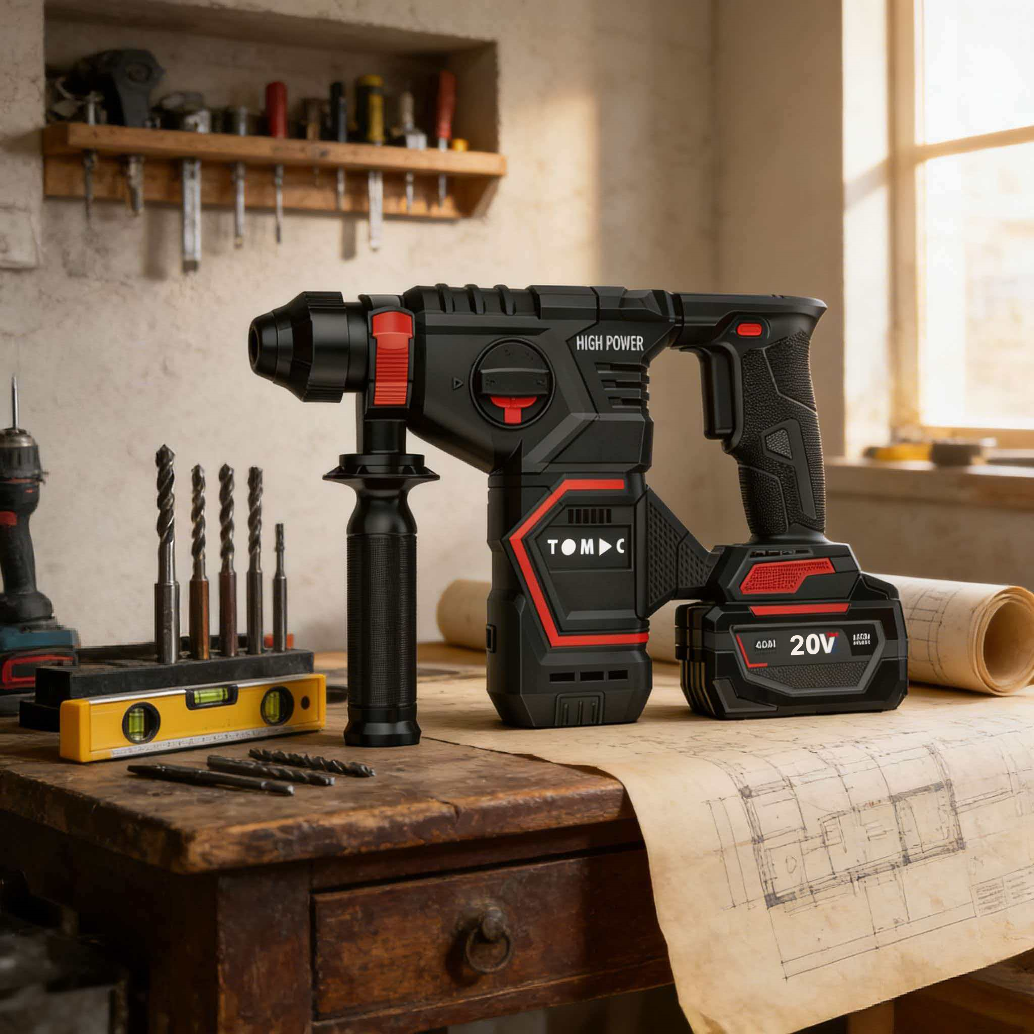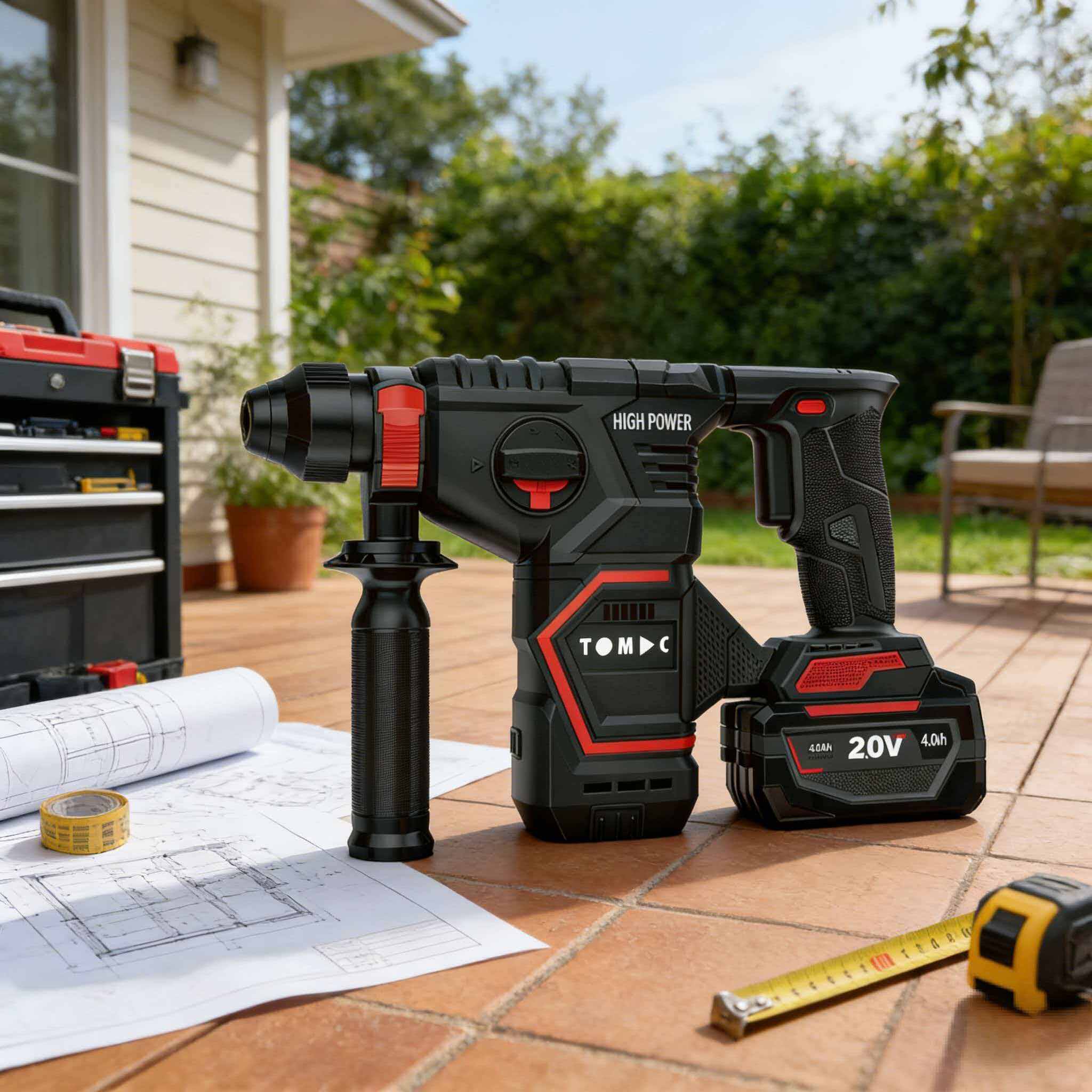 TC116228 TOMAC 20V Brushless Cordless Rotary Hammer – 28mm Concrete Capacity, 4200bpm Impact Rate, 1050rpm, 4.0Ah/6.0Ah Battery, Heavy Duty Industrial SDS Kit with Auxiliary Handle,CE certified